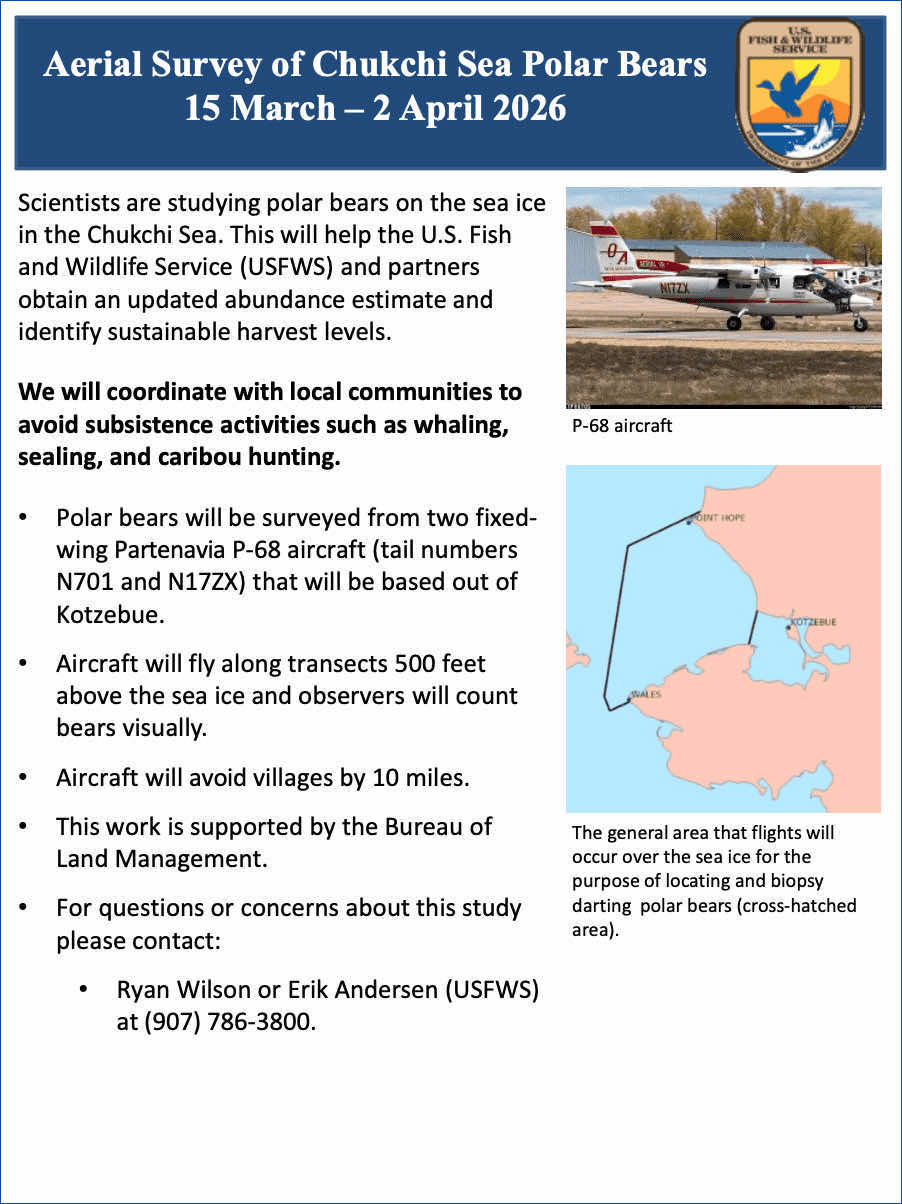 Scientists are studying polar bears on the sea ice in the Chukchi Sea. This will help the U.S. Fish and Wildlife Service (USFWS) and partners obtain an updated abundance estimate and identify sustainable harvest levels. We will coordinate with local communities to avoid subsistence activities such as whaling, sealing, and caribou hunting.